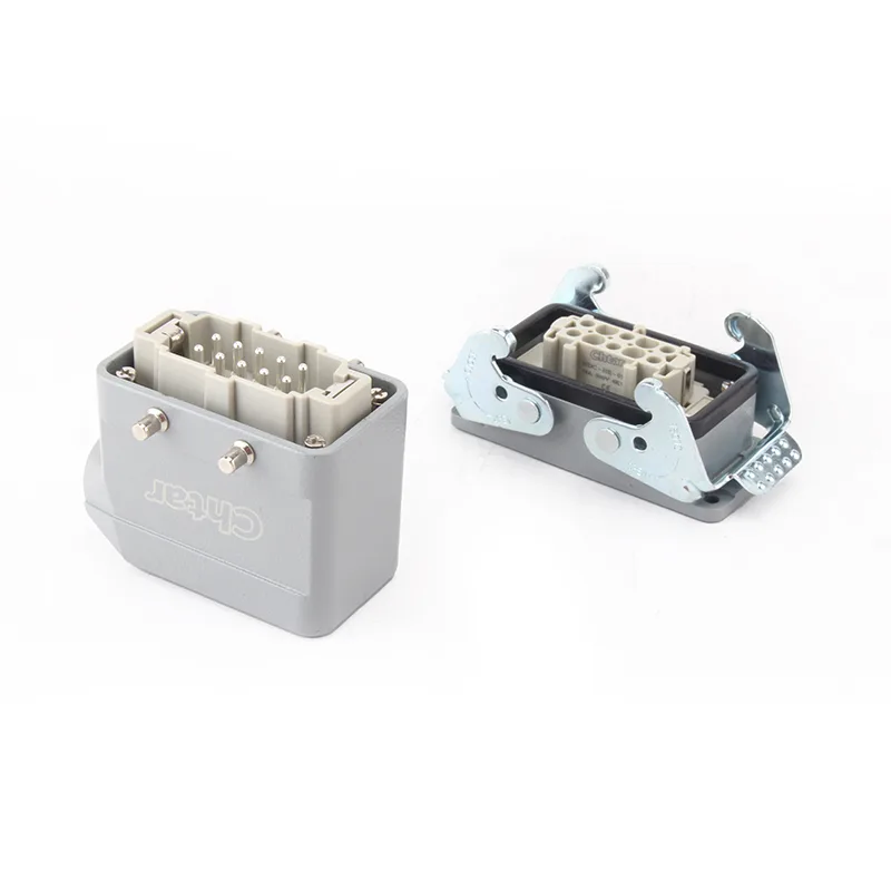 Acesti conectori CHTAR 10 Pin AG Heavy Duty sunt proiectati pe un principiu modular. Este alcătuit dintr-o carcasă de priză mamă, care poate găzdui diverse configurații de inserție cu 10 numere de contact mamă sau tată. Este realizat dintr-o pârghie dublă de blocare pentru a proteja conectorii din interior.